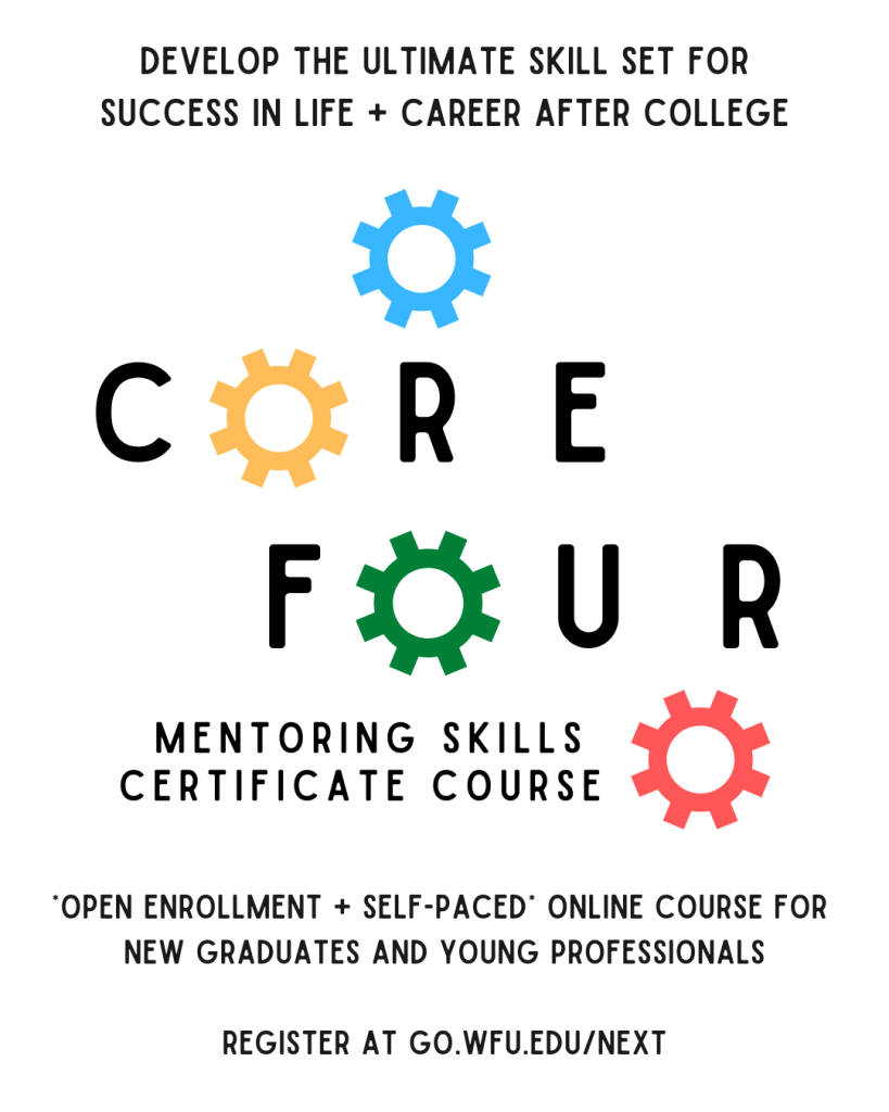 Take our COREFour Mentoring Skills Certificate Course, a self-paced online course designed to help new Wake Forest graduates and young alumni practice and apply key mentoring skills to use in their careers and lives after college.